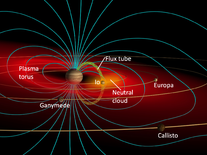 This illustration shows how Jupiter’s moons Io and Europa interact with the planet’s powerful magnetosphere, with ionized particles from Io forming a plasma torus around Jupiter. (Photo Credit: Journal of Geophysical Research)