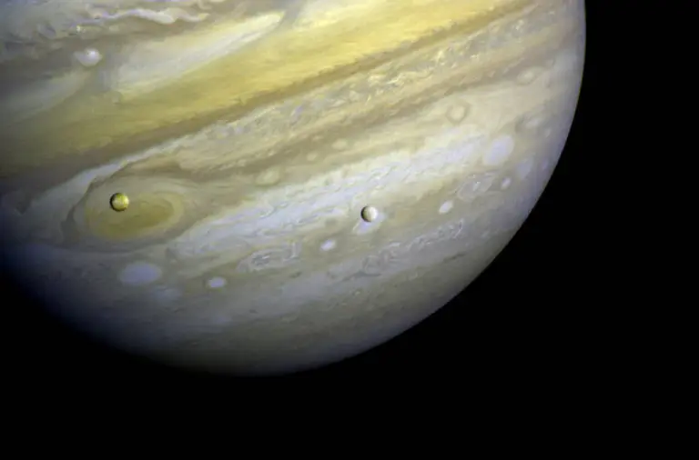 An image of Jupiter captured by Voyager 1, showcasing the swirling clouds of the Great Red Spot, with Io on the left and Europa transiting in front of the planet. (Photo Credit: NASA)
