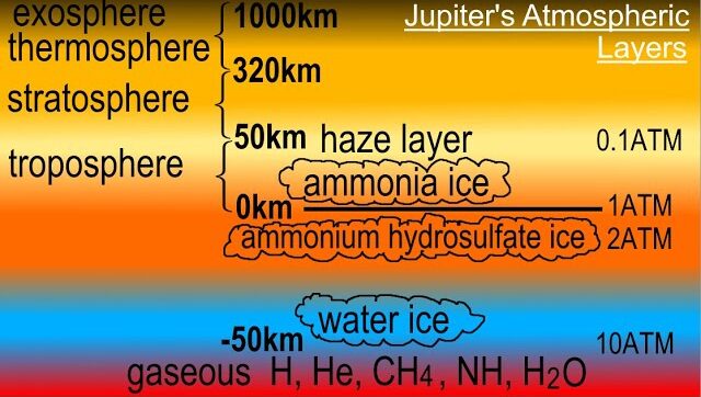 A colorful cross-section of Jupiter’s atmosphere showing layers, altitudes, cloud types, pressure (0.1–10 ATM), and composition (H, He, CH₄, NH₃, H₂O), titled “Jupiter’s Atmospheric Layers. (Photo Credit: Michel van Biezen)